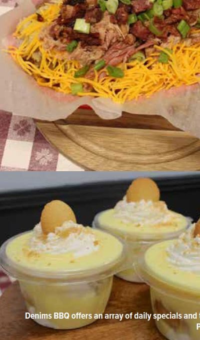 “Our most popular menu items are our Loaded Giant Potatoes—baked potatoes topped with butter, sour cream, shredded cheese, bacon bits, and diced green onions, plus your choice of pulled pork, pulled turkey, or brisket," explains Haylett. He says Denims also serves a select few items that aren’t necessarily associated with a barbecue establishment.